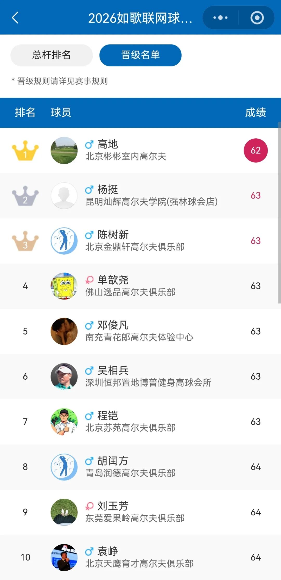 目前,来自北京彬彬室内高尔夫的高地球友凭借62杆的成绩暂时领跑,而2-7名则被63杆的选手们紧紧咬住。