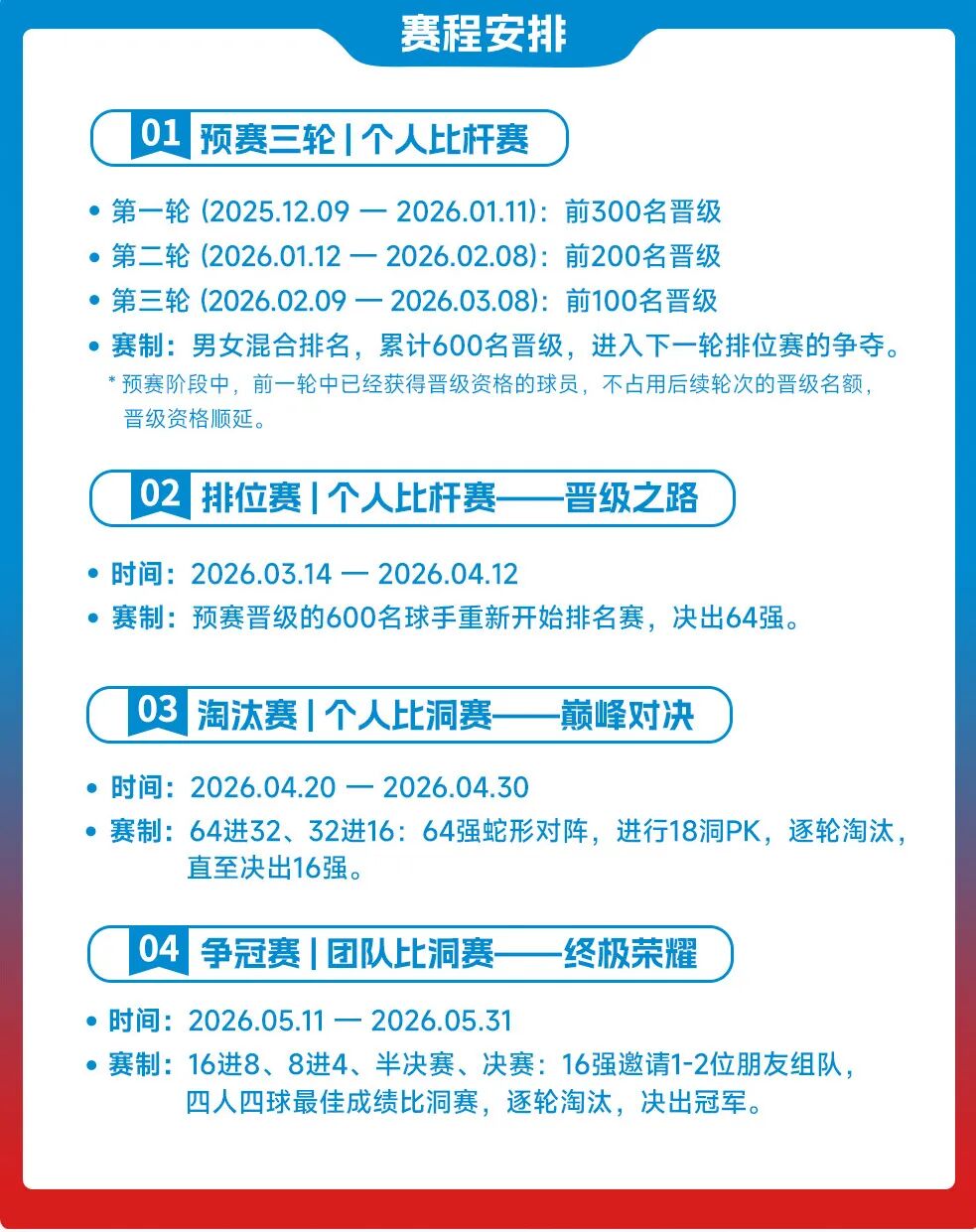 对于还在参与排位赛的600名球友来说,最后一周其实是一个非常关键的窗口期。一旦进入后续淘汰赛,比赛节奏将由排位赛产生的64名球员将按照排名进行蛇形对阵,进入64进32、32进16的个人比洞赛阶段。比赛采用18洞一轮定胜负,这意味着后续每位球员的比赛场次将大幅减少,不再具备排位赛阶段这种可以反复参与、持续刷成绩的条件。